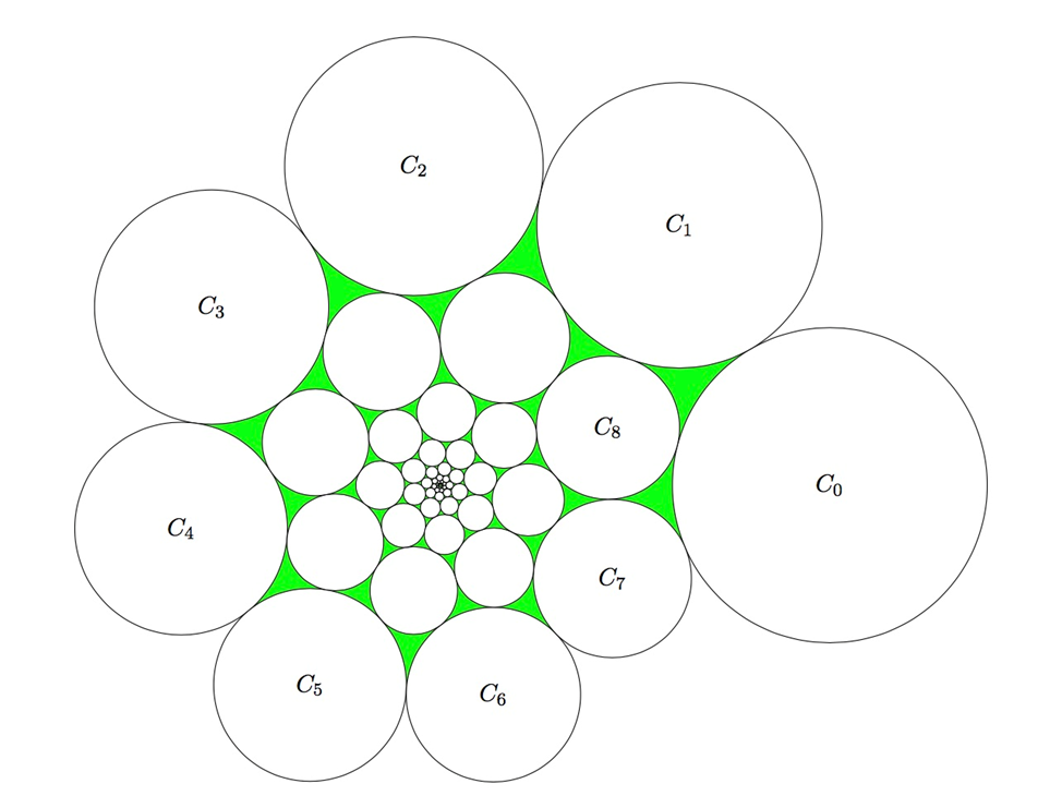 Сложность: ★★★★★★★★☆☆Это уже чистая геометрия. Бесконечная последовательность окружностей, связанных масштабированием и поворотом относительно начала координат, образует сложную самоподобную спираль. Условия касания фиксированных окружностей жестко задают коэффициент масштабирования и угол поворота, а искомая величина – суммарная площадь криволинейных треугольников между ними – требует аккуратного учета геометрических соотношений и сходимости бесконечного процесса.