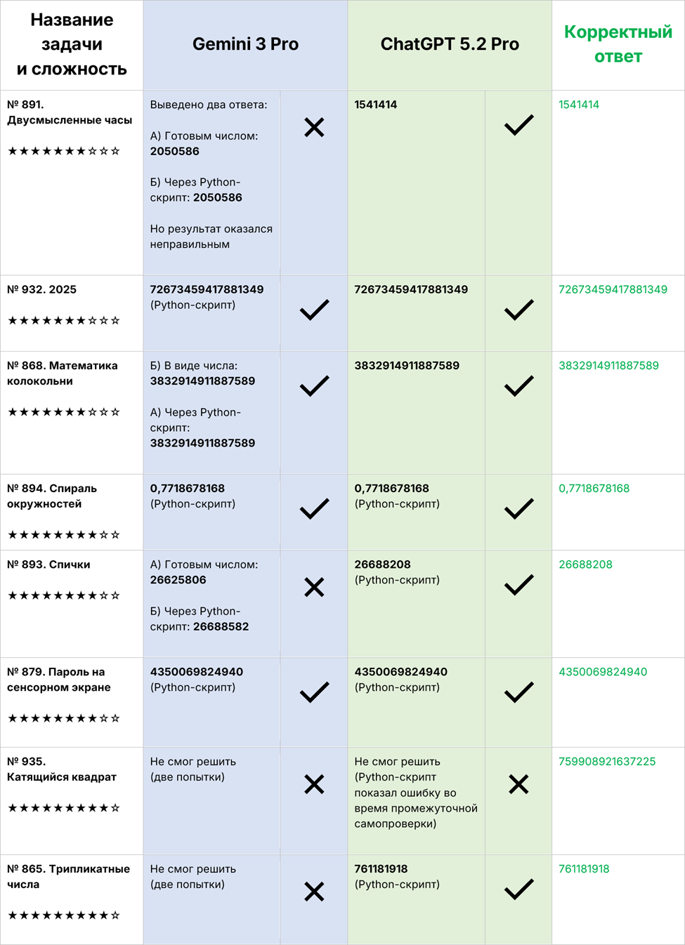 Здесь обе модели впервые по-настоящему “сломались”, и это вполне показательно. Gemini 3 Pro не смог сгенерировать ответ для этой задачи.ChatGPT 5.2 Pro продвинулся дальше – он корректно распознал, что задача сводится к анализу рациональности углов поворота и их связи с алгебраическими числами, – но споткнулся на этапе самопроверки: уже известное контрольное значение не сошлось, что прямо указывало на ошибку в формуле или коде.В итоге обе модели не смогли дойти до финального правильного ответа – 759908921637225. Этот результат иллюстрирует пределы текущих LLM: задачи, где требуется совместить строгую геометрию, теорию чисел и масштабирование до 10^8, пока остаются для них крайне сложными даже при наличии примеров и проверочных точек.