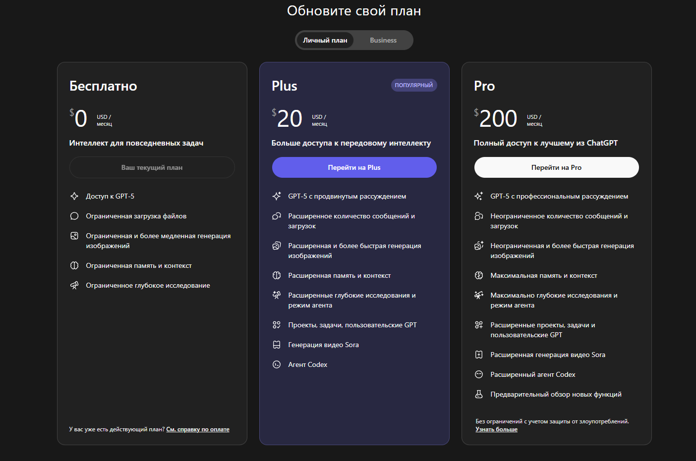 Контекстное окно устанавливает верхний предел объема данных, которые модель способна обработать за один запрос или диалог. Оно измеряется в токенах — кусочках информации, на которые модель дробит наш текст. Этот параметр определяет возможности работы с крупными документами, сохранения истории разговора и выполнения многоэтапных задач.На официальном сайте OpenAI выбор определенного тарифа непосредственно влияет на ограничения контекстного окна: