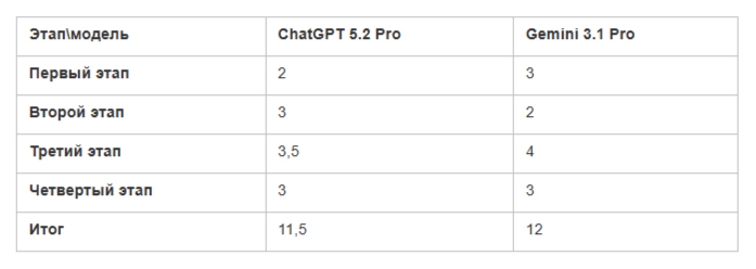 Итогом стал плюс-минус ожидаемый результат – победила модель от Google. Однако хочется сказать, что они находятся примерно на одинаковом уровне, в разделе задач на каждый день, исходя из моих тестов. Разрыв не такой уж и большой.Gemini очень любит давать максимально краткие ответы, если ее не просить о большем. Не знаю, может только у меня такое, но краткость я замечаю очень часто, при взаимодействии с этой моделью.ChatGPT несмотря на прошедшее время, держится уверенно. Хоть иногда и не справляется, например, с математикой. Единственный минус, который я нашел – это цена. Использовать прошную модельку от Google в разы дешевле и быстрее, чем от Open AI.В любом случае, конкретный выбор за вас я не делаю. Моей целью было выбрать лучшего, и по всем пунктам лидирует Gemini 3.1 Pro, который превосходит в некоторых моментах ChatGPT 5.2 Pro по цене, качеству и скорости. Основной выбор уже делать вам самим, а я лишь дал некоторую информацию из тестов, проведенных мной.