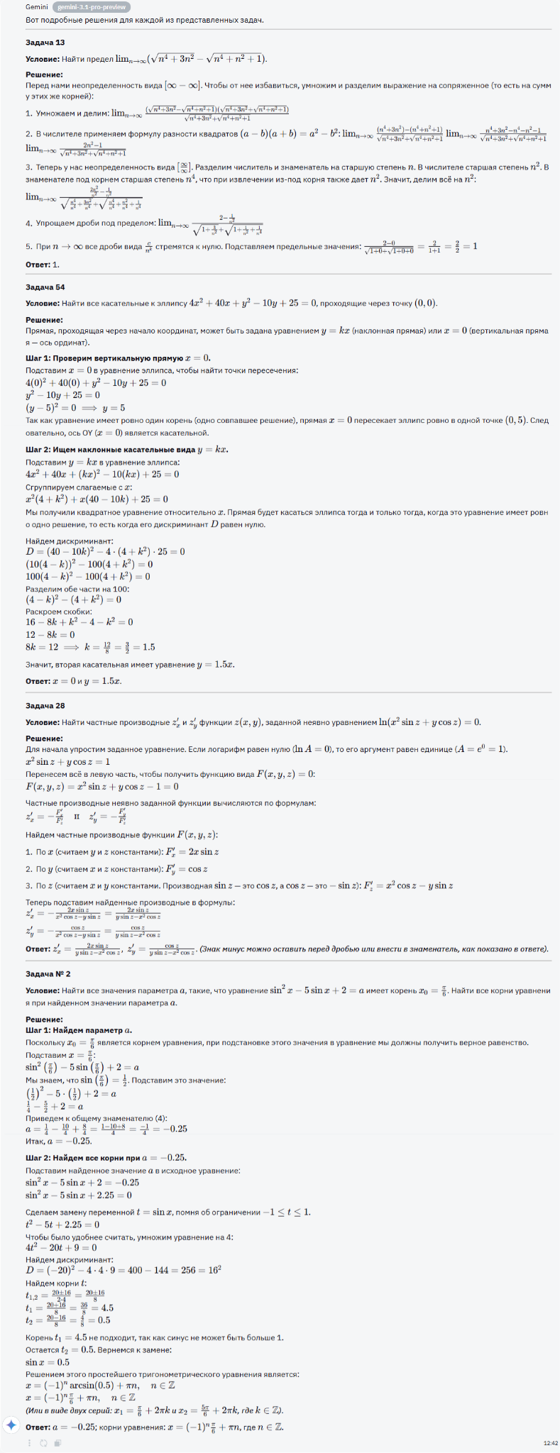ChatGPT 5.2 Pro почти справляется со всеми данными задачами. Единственное, где он частично провалился – уравнение с параметром. Изначально я подумал, что модель потеряла корни, но все оказалось куда проще. Она просто не довела ответ до конечного вида.С одной стороны, задача решена верна, но с другой у нас не доведенный до конечного вида ответ. По крайней мере, за все время моего обучения математическим дисциплинам, за такое с большой вероятностью могли снизить балл или вообще не засчитать самое задание.Сделаю тут исключение и дам половину балла за этот ответ.