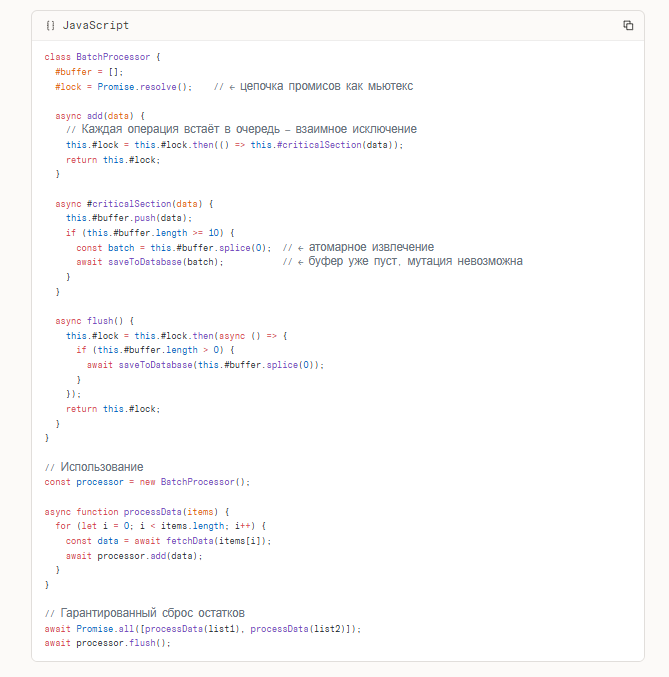 Второе задание направлено на проверку навыков программирования и умения находить архитектурные ошибки в чужом коде. Вместо написания стандартных функций мы предложили модели проанализировать асинхронный фрагмент на языке JavaScript. Основная сложность здесь заключается в использовании глобального массива для временного хранения данных. Если такая функция будет вызвана параллельно несколько раз, возникнет конфликт состояний, который приведет к потере или дублированию информации. Мы хотим проверить, сможет ли опус обнаружить эту уязвимость и предложить решение. Поехали!ЗаданиеПроанализируй этот фрагмент кода на языке JavaScript и найди в нем скрытую уязвимость, которая проявится только при высокой нагрузке или специфическом стечении обстоятельств. Объясни, как именно это сломается и как это исправить правильно:
