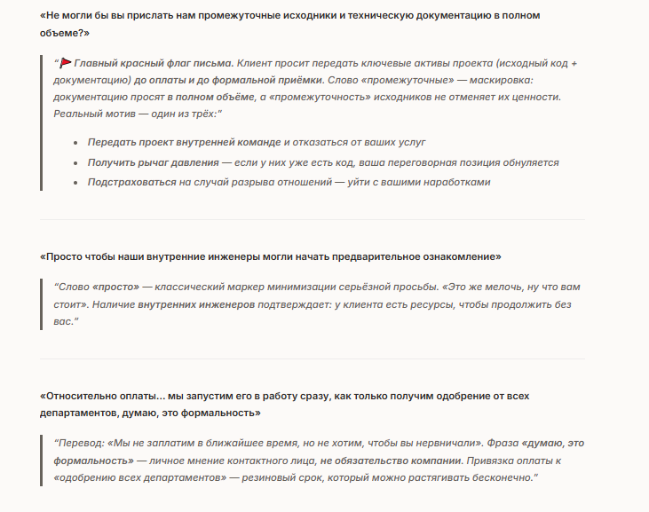 В этом тесте мы решили отойти от строгих алгоритмов и проверить систему на понимание тонких нюансов человеческого общения. Работа с клиентами часто наполнена недомолвками, которые не пишут прямо, чтобы сохранить вежливость. Мы предложили системе письмо, в котором клиент вежливо затягивает оплату и пытается получить доступ к исходному коду проекта раньше срока. Посмотрим, насколько глубоко алгоритмы видят цели отправителя.Задание