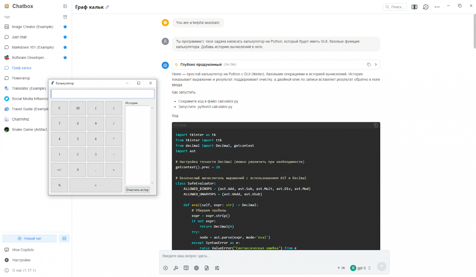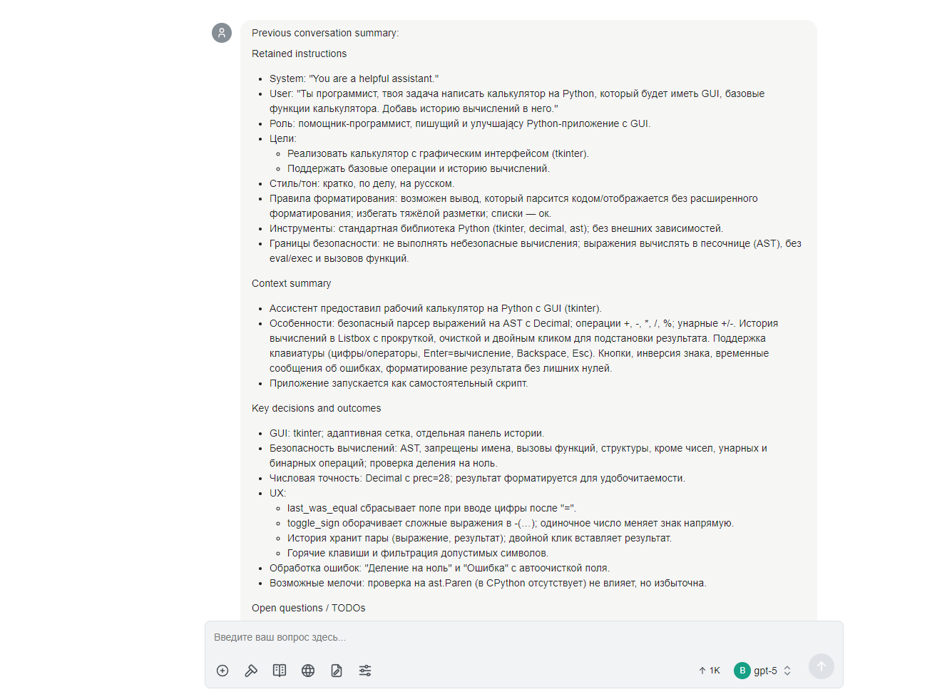 Для демонстрации работы GPT-5 написал мне калькулятор. Мое вечное задание, над которым я иногда экспериментирую... Даже была вариация, чтобы по нажатию кнопки запускалась змейка.На самом деле моя цель вовсе не демонстрация работоспособности. Важно показать именно ту функцию, о которой я говорил в самомначале — локальное хранилище данных, или архив. Эта штука действительно запала мне в душу, когда тестировал Chatbox.Контекст ограничен шестью запросами, но это лишь на первый взгляд. В поле для ввода запроса есть значок настроек (три ползунка), в которых можно изменить ограничение вплоть до бесконечного контекста.Бесконечный контекст - круто, однако чем больше он заполняется, тем больше денег будет списано. Нам это ни к чему? Именно для этого нужна архивация. Приложение структурирует всю информацию, выделяет основное и отправляет это в архив, сохраняя контекст в памяти, но снижая его объем.Обратите внимание снова на поле ввода запроса: справа снизу есть выбор модели и количество занятых токенов. Сейчас видно значение около трех тысяч, но если нажать туда и выбрать архивацию, число уменьшится втрое.