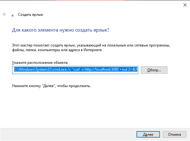 Думаю, никто не захочет постоянно вручную вводить весь этот ужас. Чтобы избежать этой проблемы, можно создать двойной ярлык. Он откроет командную строку, запустит сервер и сразу перейдет на сайт. Однако есть нюанс: страница загрузится раньше, чем стартует сервер... Так что придется немного подождать, обновляя страницу.Щелкаем правой кнопкой мыши на рабочем столе и создаем новый ярлык. В поле пути к объекту вводим:C:\Windows\System32\cmd.exe /c "curl -s http://localhost:3080 >nul 2>&1 && (start http://localhost:3080) || (start cmd /k cd /d D:\LibreChat ^&^& npm run backend & timeout /t 3 >nul & start http://localhost:3080)