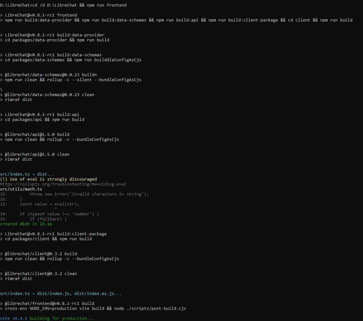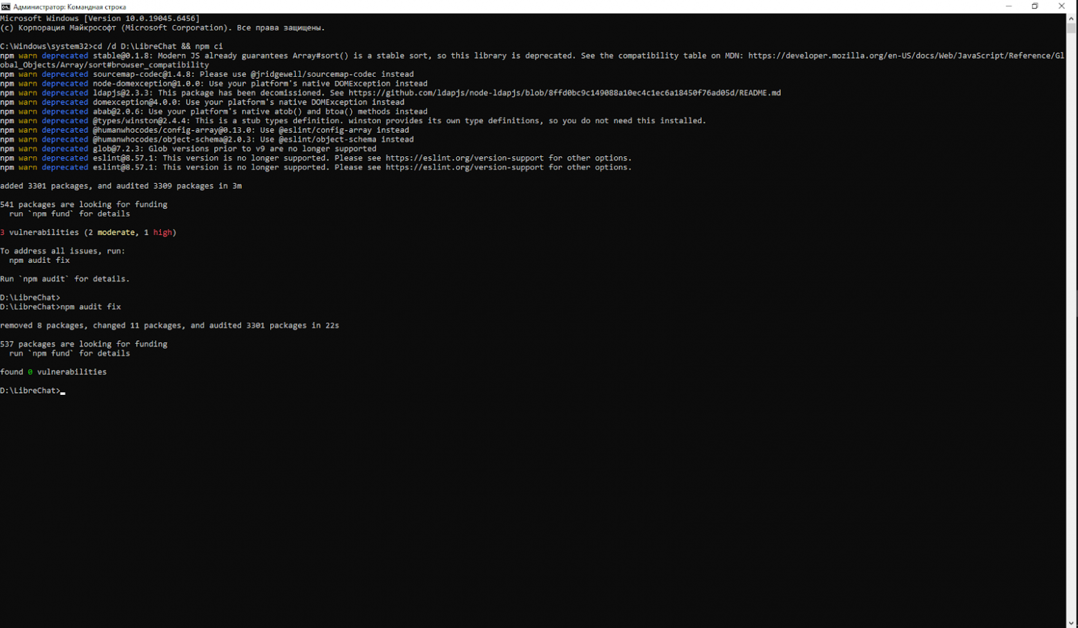 Открываем командную строку - это можно сделать двумя способами: нажать сочетание клавиш Win+R и ввести там cmd, либо воспользоваться обычным поиском.Для начала установим необходимые модули с помощью команды:cd /d D:\LibreChat && npm ciЭта команда запустит Node.js, который установит требуемые для работы LibreChat файлы.