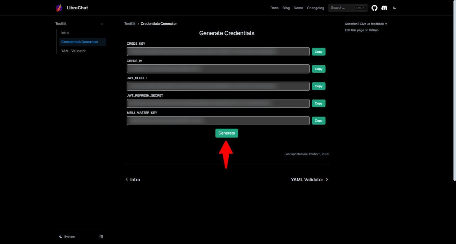 Переходим в диск D и открываем скопированную папку. Нужен файл .env.example. Копируем его и переименовываем в простое .env. Затем открываем любым удобным способом. Я лично воспользуюсь VS Code.Первое, что надо сделать в этом файле - заполнить секретные ключи. Поскольку они разбросаны по разным местам, используем сочетание клавиш Ctrl + F для поиска.Открываем официальный генератор ключей и генерируем необходимые значения. Заполняем соответствующие поля в .env: CREDS_KEY, CREDS_IV, JWT_SECRET, JWT_REFRESH_SECRET, MEILI_MASTER_KEY.