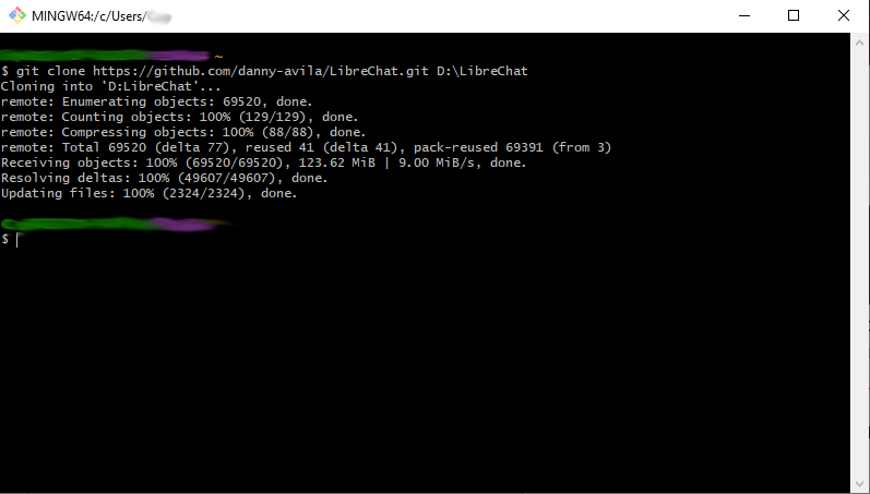 Первым делом открываем Git Bash - терминал, который мы установили последним из всех программ. В нем вводим команду для копирования файлов LibreChat с официального репозитория GitHub.git clone https://github.com/danny-avila/LibreChat.git D:\LibreChat