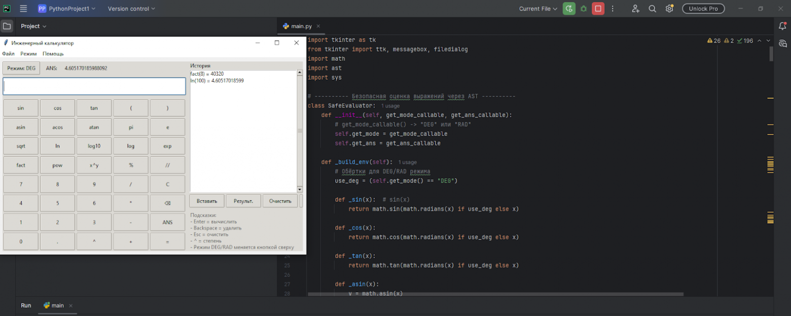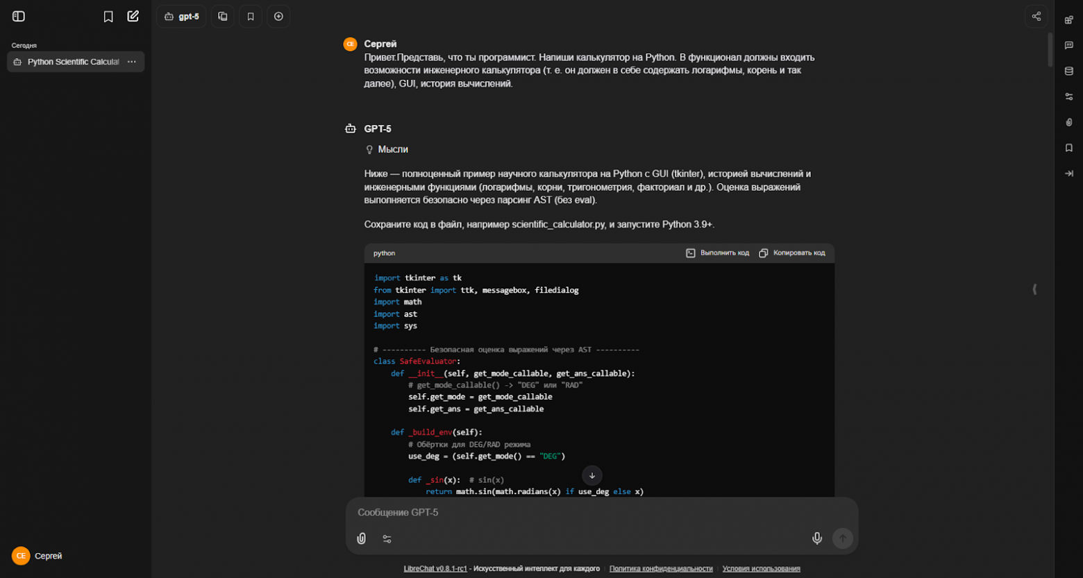Чтобы начать пользоваться сервисом, в левом верхнем углу нужно выбрать модель. Если вы удалили все примеры, то у вас останется там только BotHub, иначе придется выбирать его из списка. Не стоит надеяться, что указанные варианты из примеров заработают.Выбрав модель, задаем свой вопрос. Мой привычный тест - написание калькулятора на Python. Конечно, сейчас я немного исхитрился и попросил написать именно инженерную версию. Посмотрим, что из этого выйдет.