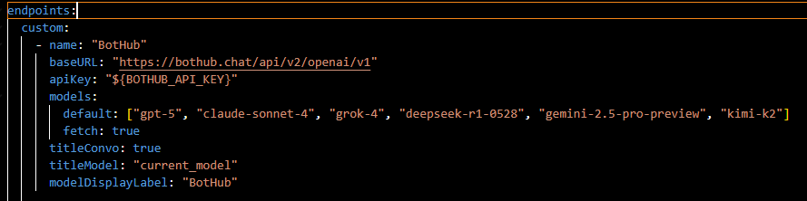 Возвращаемся обратно в папку и ищем файл librechat.example.yaml, снова копируем и переименовываем его в librechat.yaml. Затем открываем любым удобным вам способом.Используя прошлый способ поиска нужного фрагмента, находим endpoints. Обнаружив соответствующий раздел, вставляем сюда следующий фрагмент кода:- name: "BotHub" baseURL: "https://bothub.chat/api/v2/openai/v1" apiKey: "${BOTHUB_API_KEY}" models: default: ["gpt-5", "claude-sonnet-4", "grok-4", "deepseek-r1-0528", "gemini-2.5-pro-preview", "kimi-k2"] fetch: true titleConvo: true titleModel: "current_model" modelDisplayLabel: "BotHubВажно помнить про отступы, иначе ничего не заработает.Здесь параметр apiKey берет ранее заданный вами ключ из файла .env. Обратите внимание, что в списке default указано всего несколько моделей, хотя фактически благодаря настройкеfetch: true модели будут подгружаться автоматически.